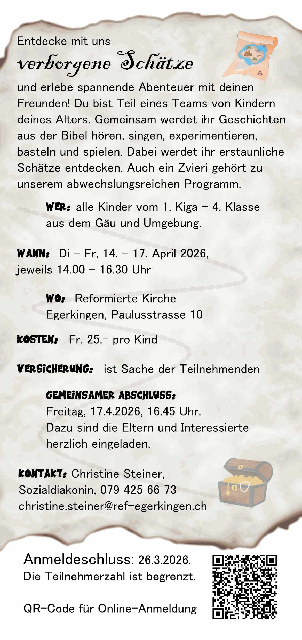 Eine Woche lang singen, basteln, spielen, gemeinsam Zvieri essen und biblische Geschichten hören: Das ist die Kinderwoche in den Frühlingsferien. Eingeladen sind alle Kinder vom 1. Kindergarten bis zur 4. Klasse.